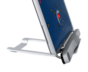 通过PCEye支架将PCEye眼控仪与Windows平板电脑连接,方便快捷。只需将眼控仪卡扣在内置的磁性安装板上,并将平板电脑滑入此支架,即可完成固定和搭配。通过USB线将PCEye眼控仪与平板电脑连接。支架可放在桌子上,也可以安装在轮椅支架或落地支架上。PCEye眼控仪单独出售。